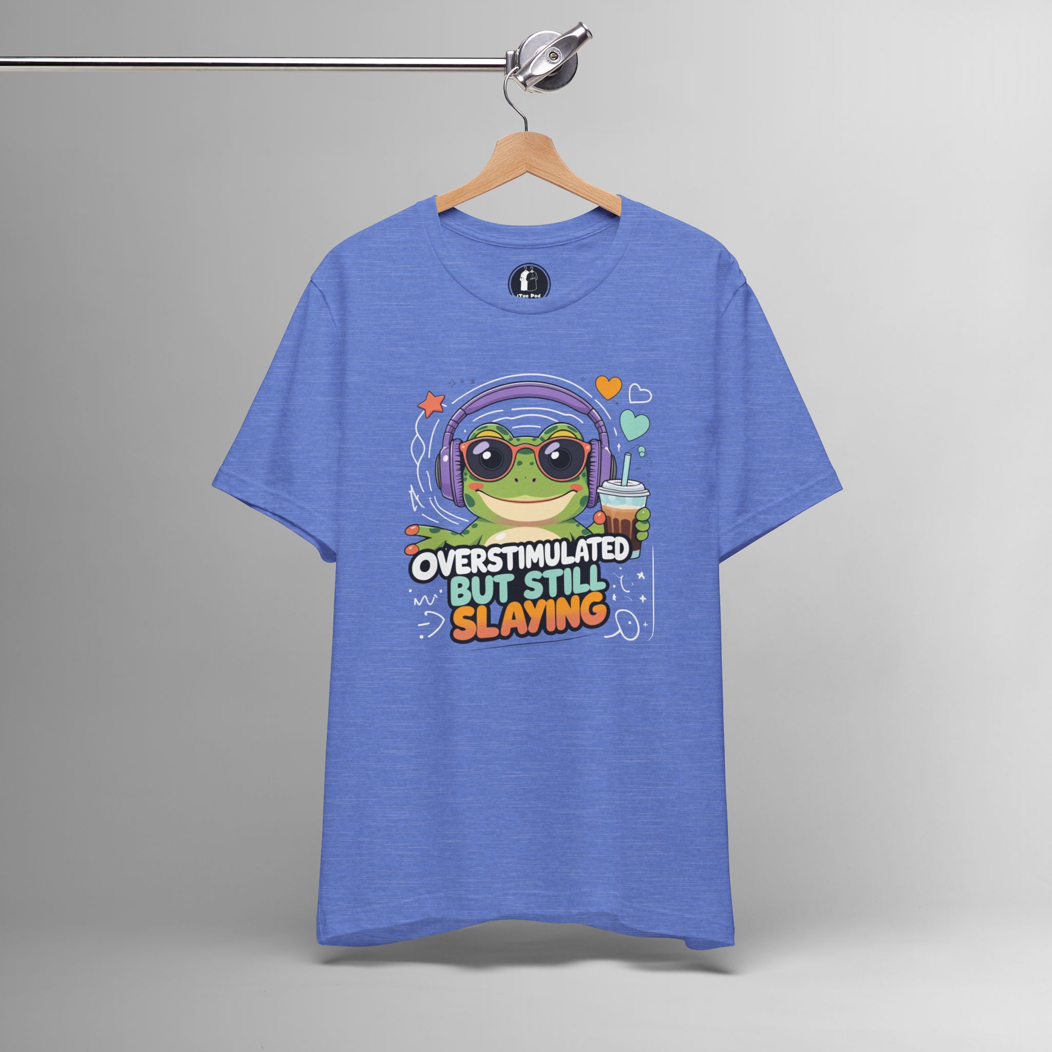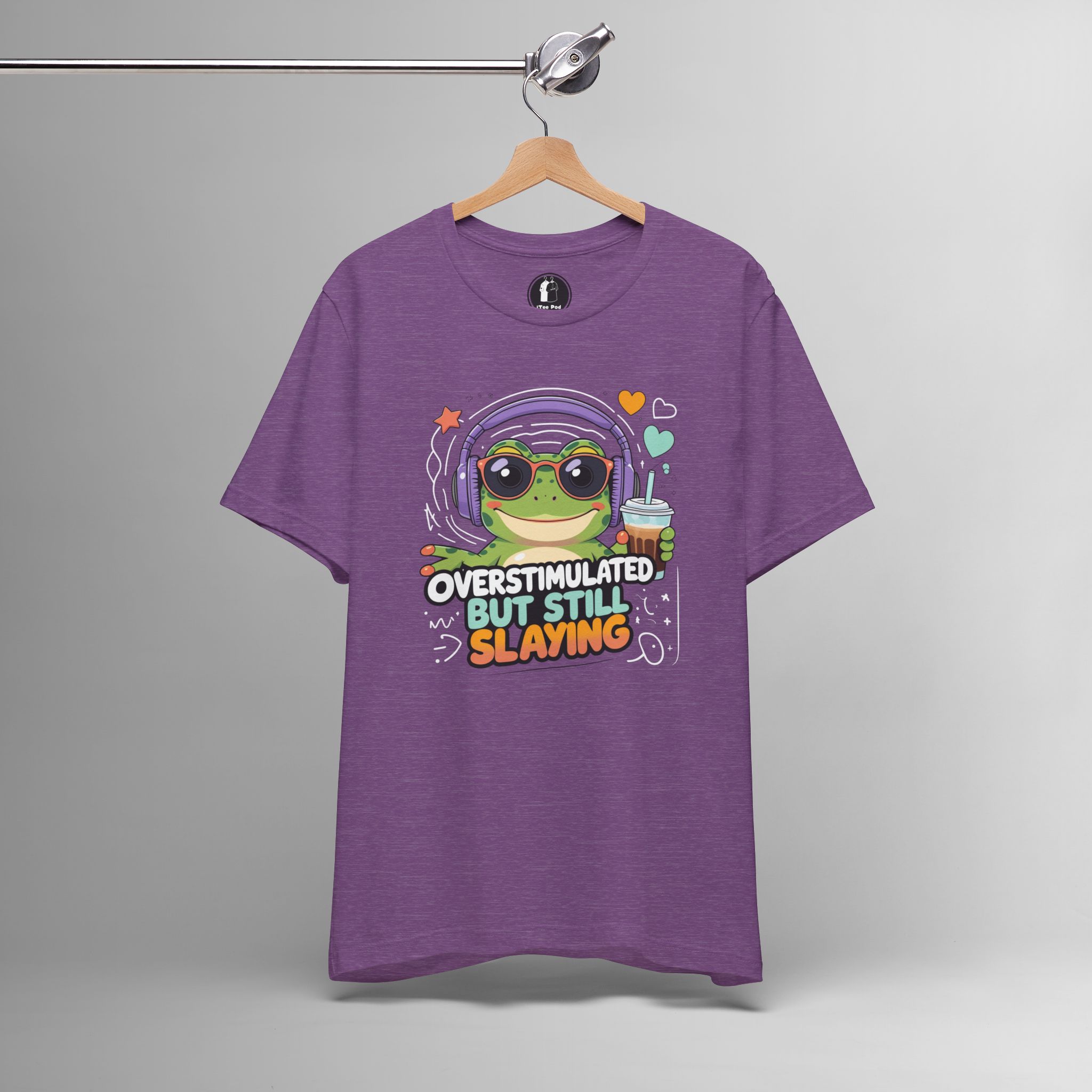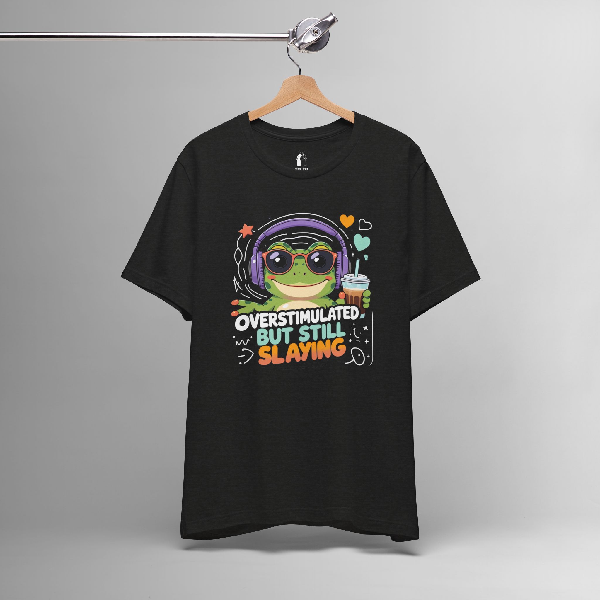 This Overstimulated But Still Slaying Shirt features a cute frog design, perfect for those dealing with sensory overload or ADHD. The tee gives off a fun and vibrant vibe, making it a great addition to any casual outfit. Ideal for teens and adults who want to make a statement and show off their unique style. Perfect for wearing on casual days or to special events like Comic-Con.