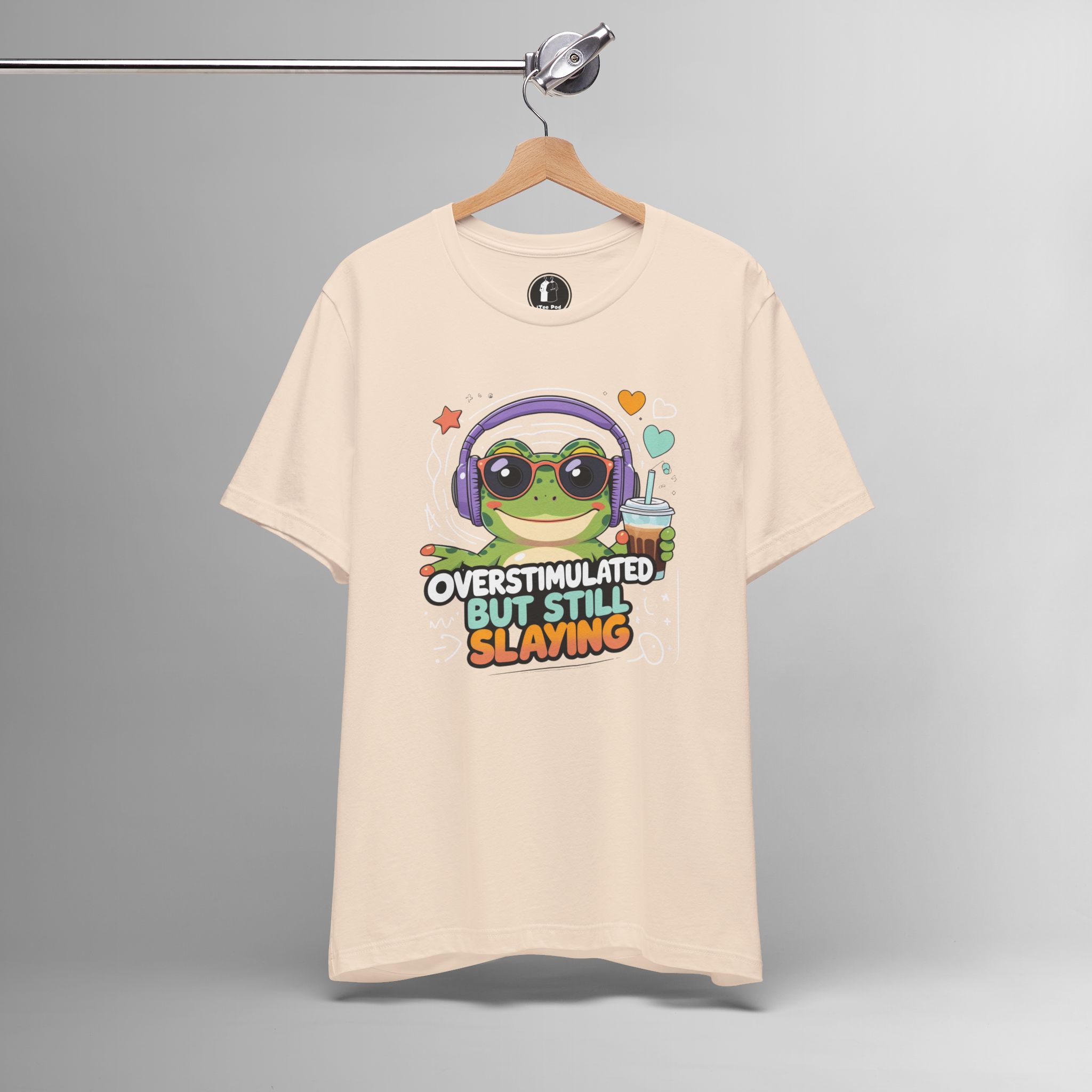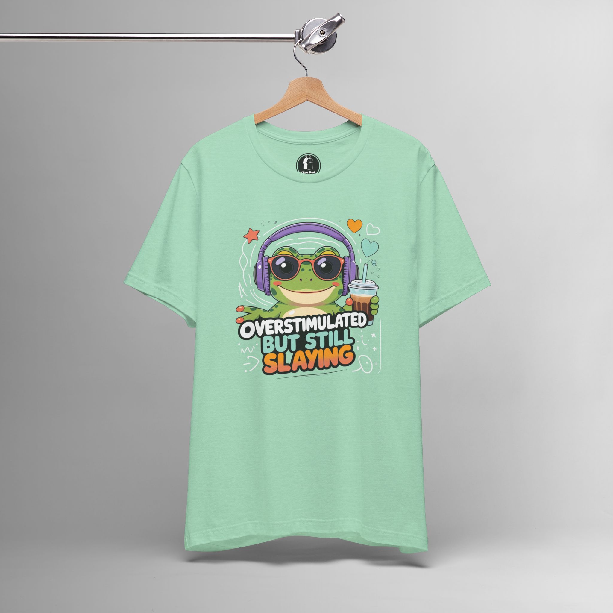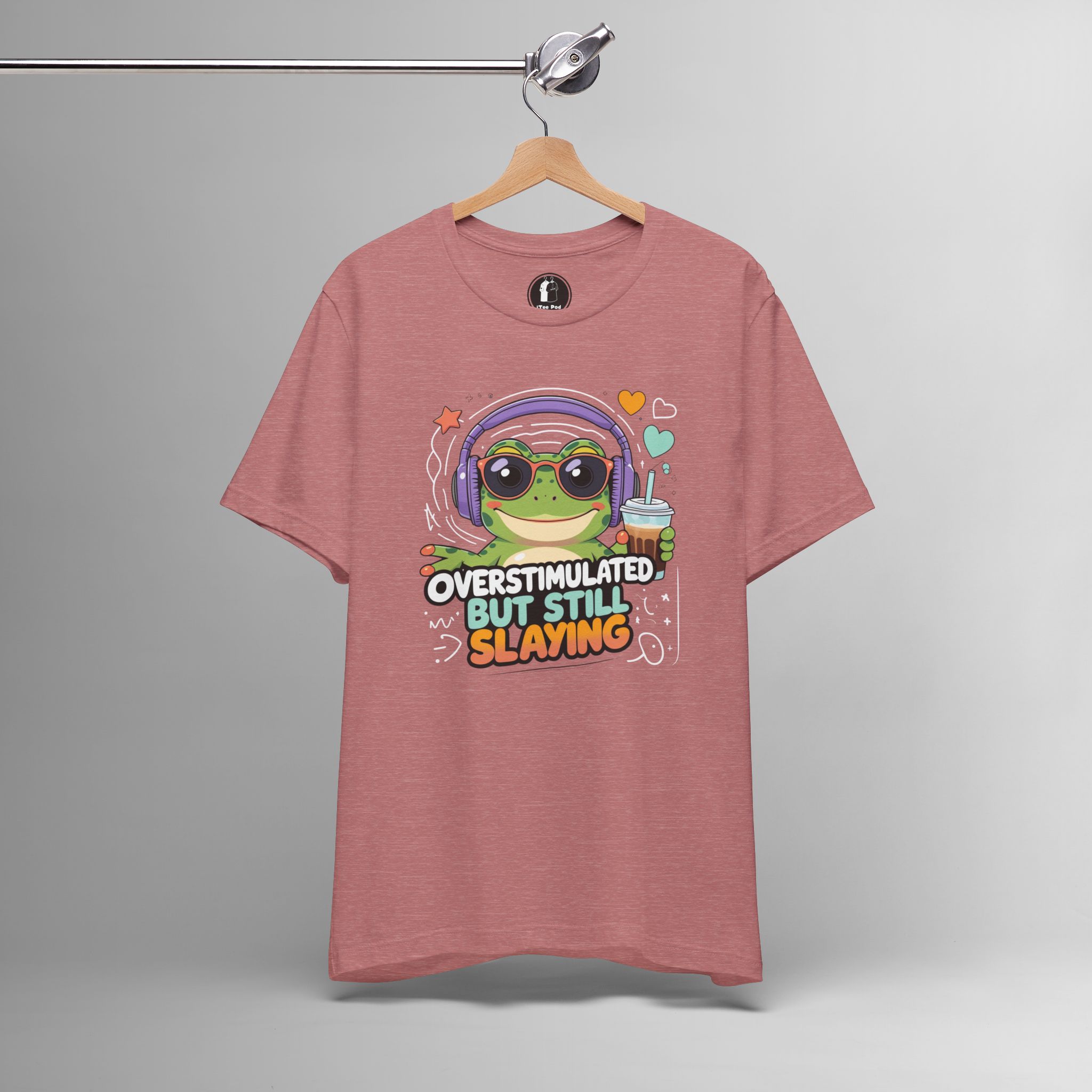 This Overstimulated But Still Slaying Shirt features a cute frog design, perfect for those dealing with sensory overload or ADHD. The tee gives off a fun and vibrant vibe, making it a great addition to any casual outfit. Ideal for teens and adults who want to make a statement and show off their unique style. Perfect for wearing on casual days or to special events like Comic-Con.